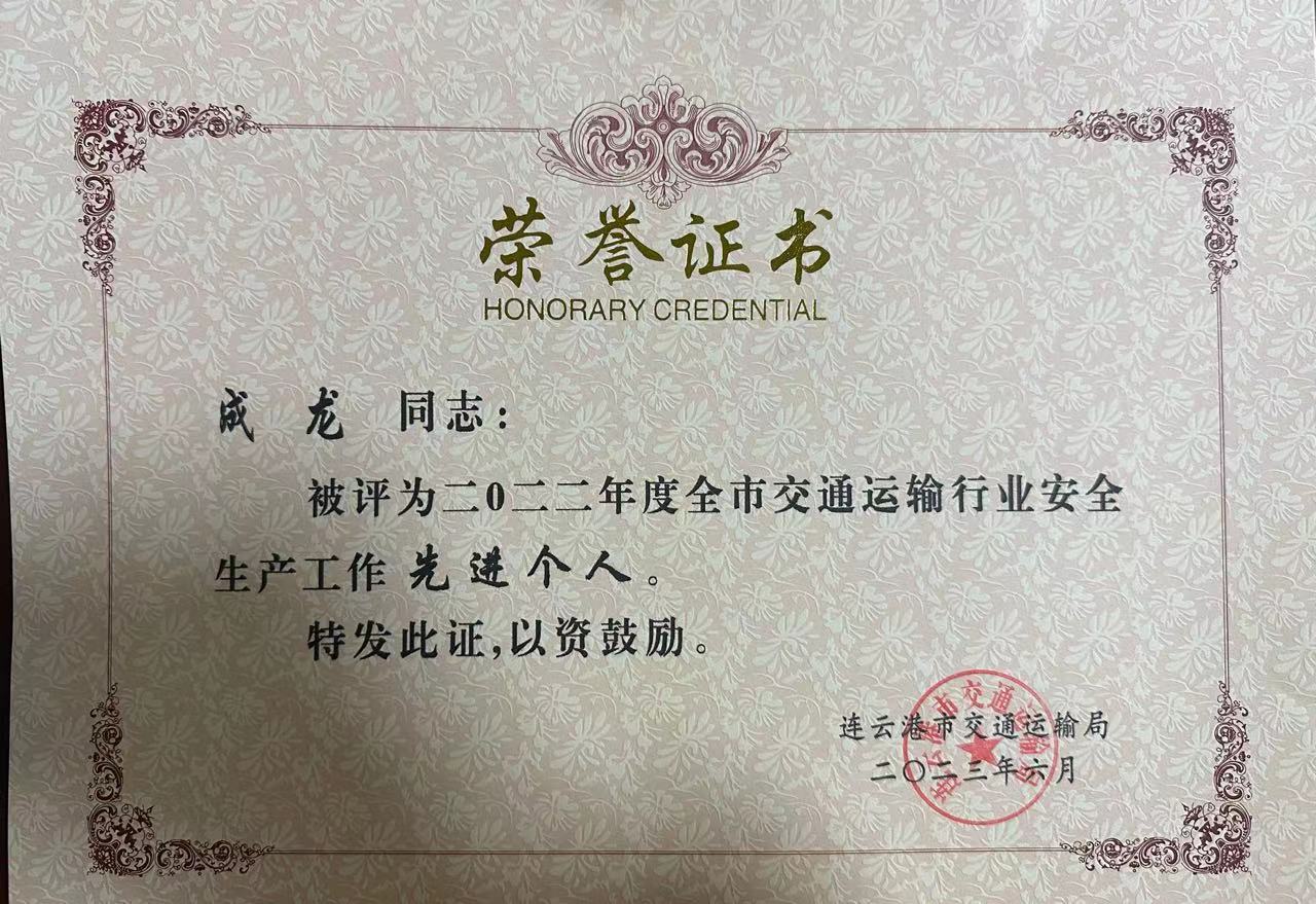日前,《關(guān)于表彰2022年度全市交通運輸行業(yè)安全生產(chǎn)工作先進(jìn)單位、先進(jìn)集體和先進(jìn)個(gè)人的通報》,連汽出租公司獲得2022年度全市交通運輸行業(yè)安全生產(chǎn)工作先進(jìn)單位,公司支部書(shū)記成龍同志被評為2022年度全市交通運輸行業(yè)安全生產(chǎn)工作先進(jìn)個(gè)人榮譽(yù)稱(chēng)號。