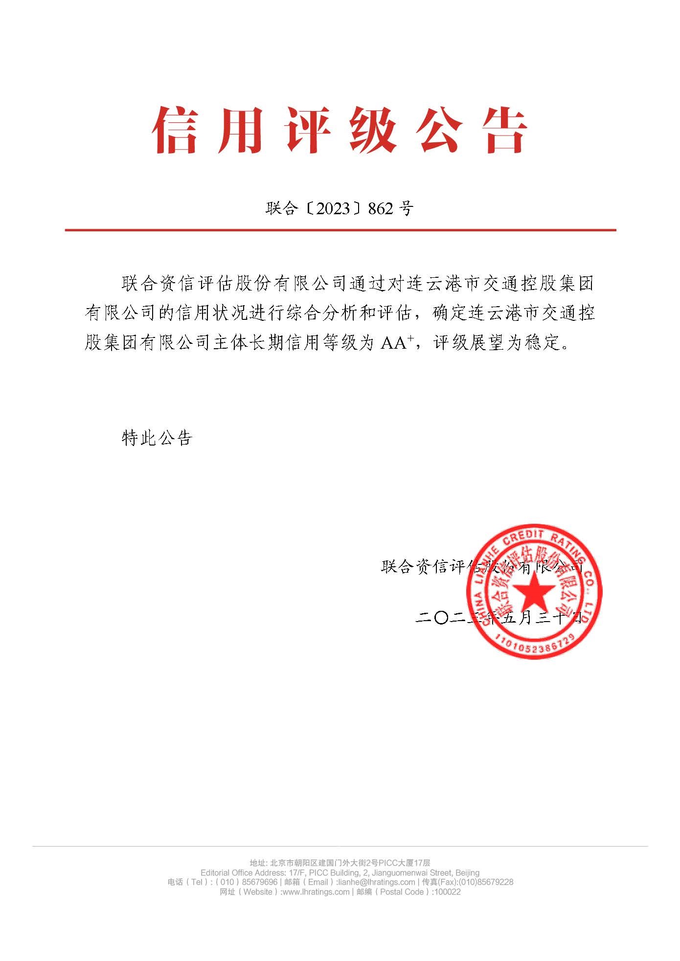 近日,聯(lián)合資信評估股份有限公司發(fā)布信用評級公告,確定連云港市交通控股集團有限公司(以下簡(jiǎn)稱(chēng)“交通控股集團”)主體長(cháng)期信用等級為AA+,評級展望為穩定。