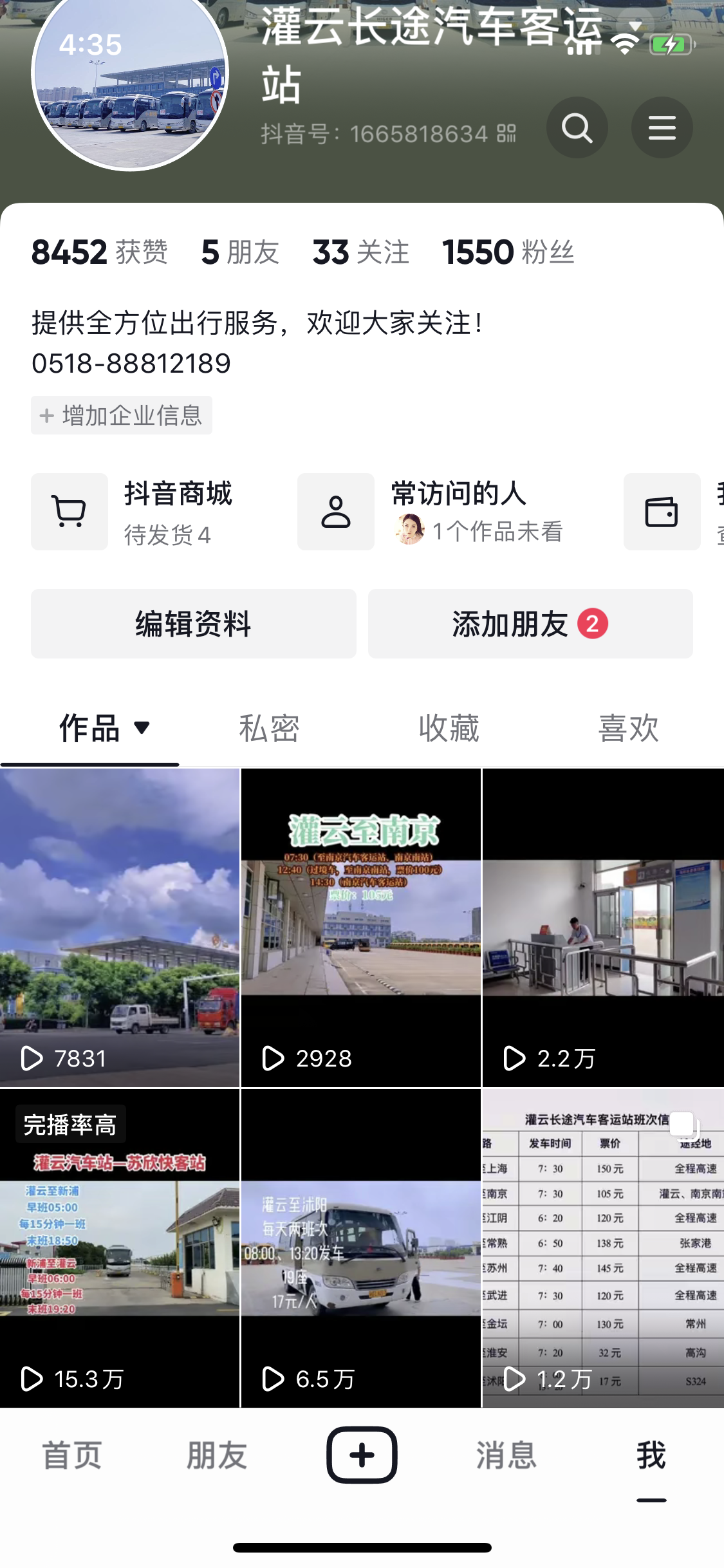 7月1日,連汽灌云長(cháng)途汽車(chē)客運站抖音號正式開(kāi)通。開(kāi)通以來(lái),連汽灌云長(cháng)途汽車(chē)客運站抖音號粉絲持續增長(cháng),粉絲量現已突破1550人,雖然這個(gè)數字對于抖音平臺來(lái)說(shuō)數量并不算多,但也是近一個(gè)月以來(lái)工作人員共同努力的成果。