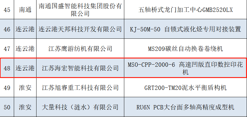 近日,江蘇省工業(yè)和信息化廳公示了2023年江蘇省首臺(套)重大裝備擬認定名單。市交通控股集團權屬江蘇海宏智能科技有限公司(以下簡(jiǎn)稱(chēng)海宏科技)的MSO-CPP-200-6高速凹版直印數控印花機在參評項目中脫穎而出,成功入選。