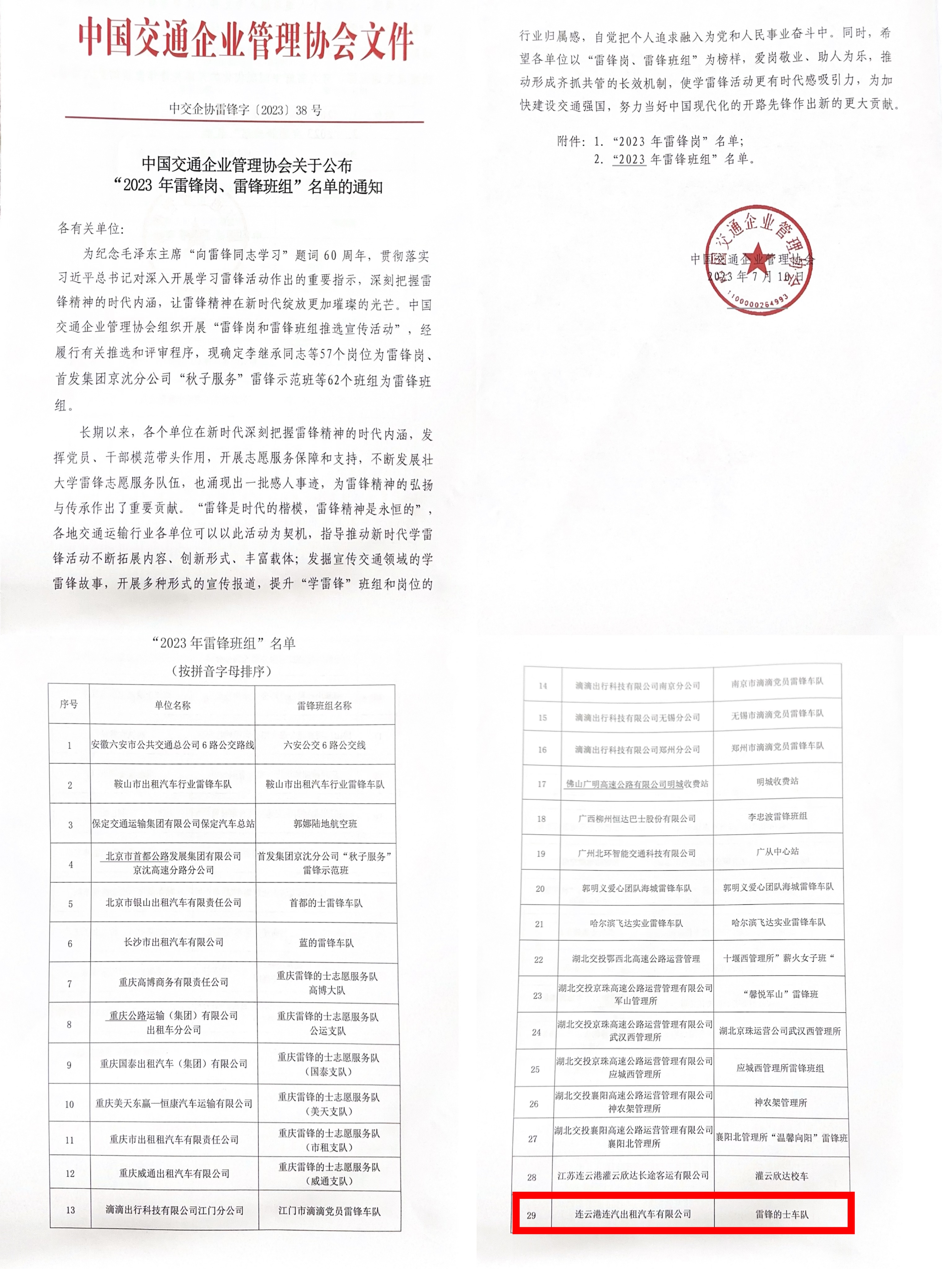 8月10日,中國交通企業(yè)管理協(xié)會(huì )公布2023年度全國交通行業(yè)雷鋒崗和雷鋒班組名單,連汽出租汽車(chē)有限公司“雷鋒的士”車(chē)隊榮獲“雷鋒班組”榮譽(yù)稱(chēng)號。