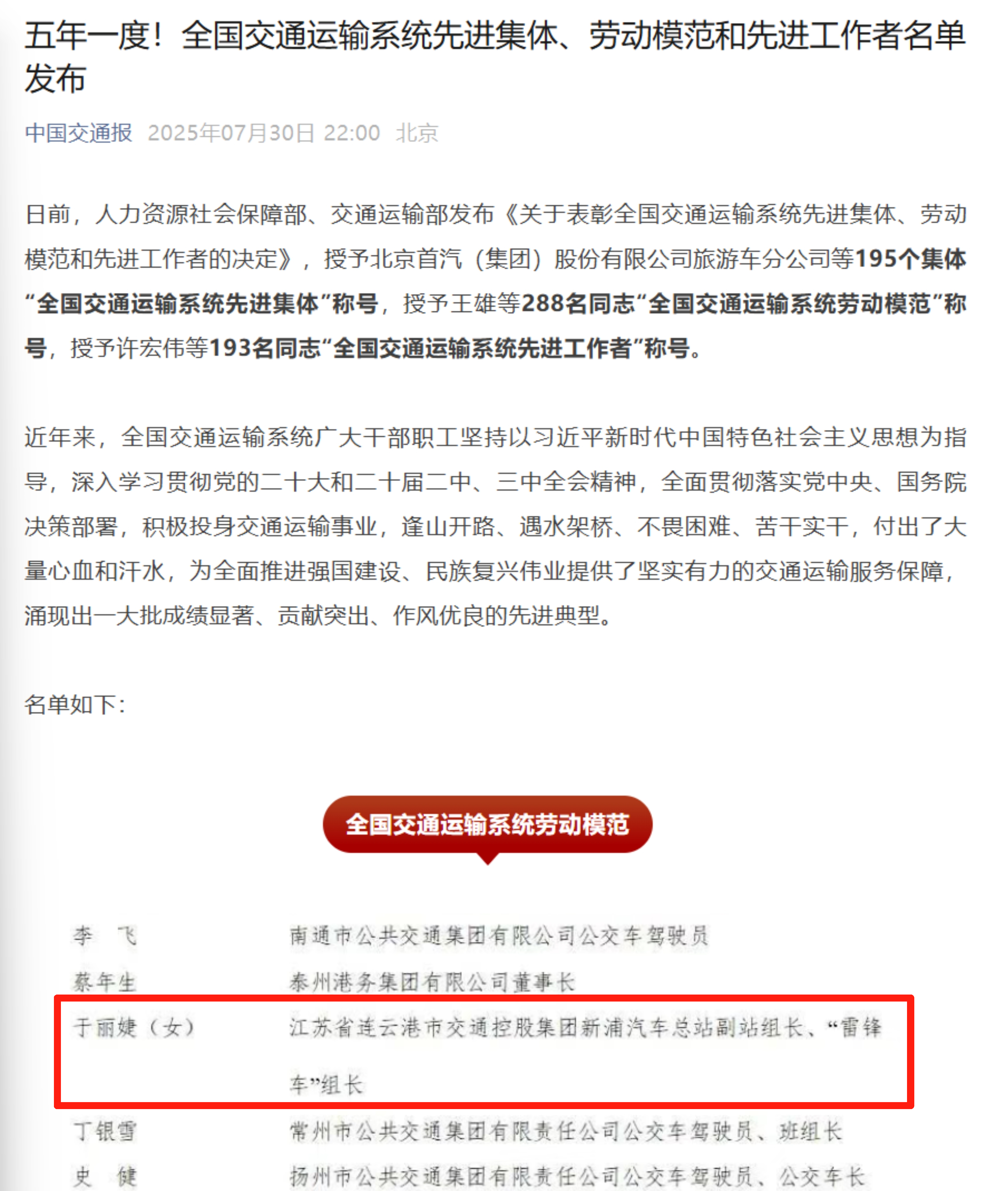 于麗婕榮獲全國交通運輸系統勞動(dòng)模范:雷鋒精神的新時(shí)代踐行者