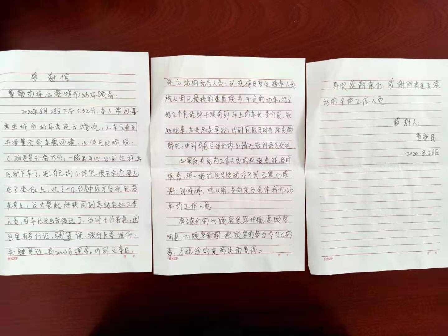 大爺回去一直惦念著(zhù)此事,想用最淳樸真誠的方式表達他的感謝。隔了幾天后,送來(lái)了錦旗及感謝信。紅艷艷的錦旗是對城市動(dòng)車(chē)工作人員的肯定。城市動(dòng)車(chē)工作人員能做到急乘客所急,憂(yōu)乘客所憂(yōu),盡最大的努力去幫助他們。