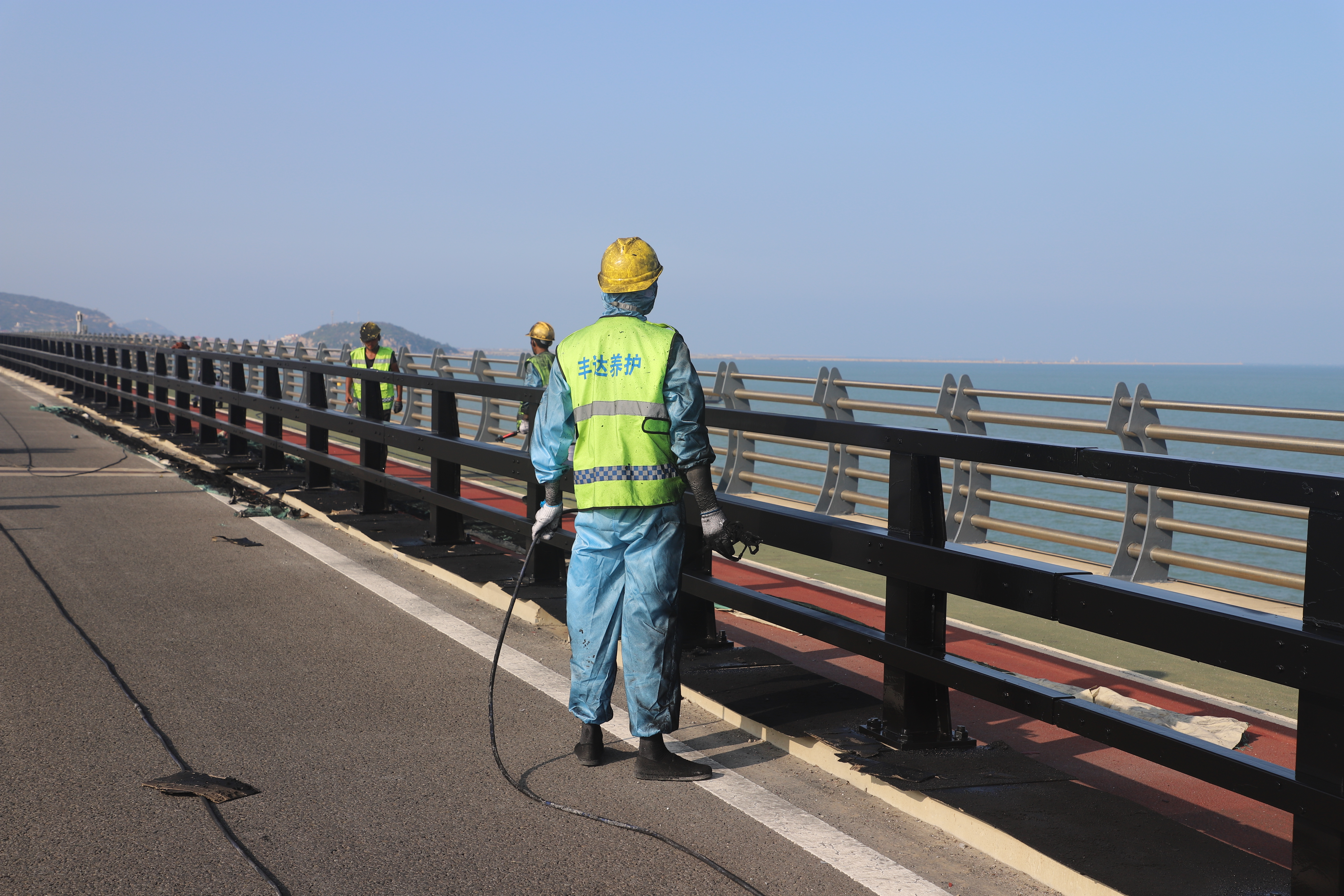 連云港海濱大道是一條彰顯港城山海相擁、港產(chǎn)城相融的濱海旅游觀(guān)光大道,該大道沿著(zhù)連云港東海岸線(xiàn)貫穿南北,將連云港港口、產(chǎn)業(yè)、城區有機聯(lián)系在一起。該項目主要為跨海大橋防撞護欄進(jìn)行除銹出新,共完成油漆作業(yè)約36000m2、不銹鋼鋼管維修增設48米、橫縫焊接打磨102米、端頭封堵30個(gè)、南橋頭灌縫60米、原螺絲超長(cháng)切割處理13500根。