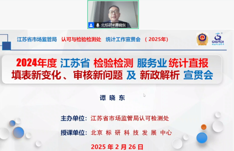 本次培訓采用“標研云課堂”進(jìn)行線(xiàn)上開(kāi)展,由北標研專(zhuān)家譚曉東老師擔任主講。培訓內容主要涉及三個(gè)方面:一是解析前期數據填報中發(fā)現的常見(jiàn)問(wèn)題及檢驗檢測機構填報注意事項;二是講解2024年度檢驗檢測服務(wù)業(yè)統計直報系統功能和數據項;三是解析2024年度新政策制度與《江蘇省檢驗服務(wù)業(yè)統計工作管理辦法》。培訓過(guò)程中設置互動(dòng)環(huán)節,幫助大家解決在工作過(guò)程中遇到的類(lèi)似問(wèn)題和困難。
