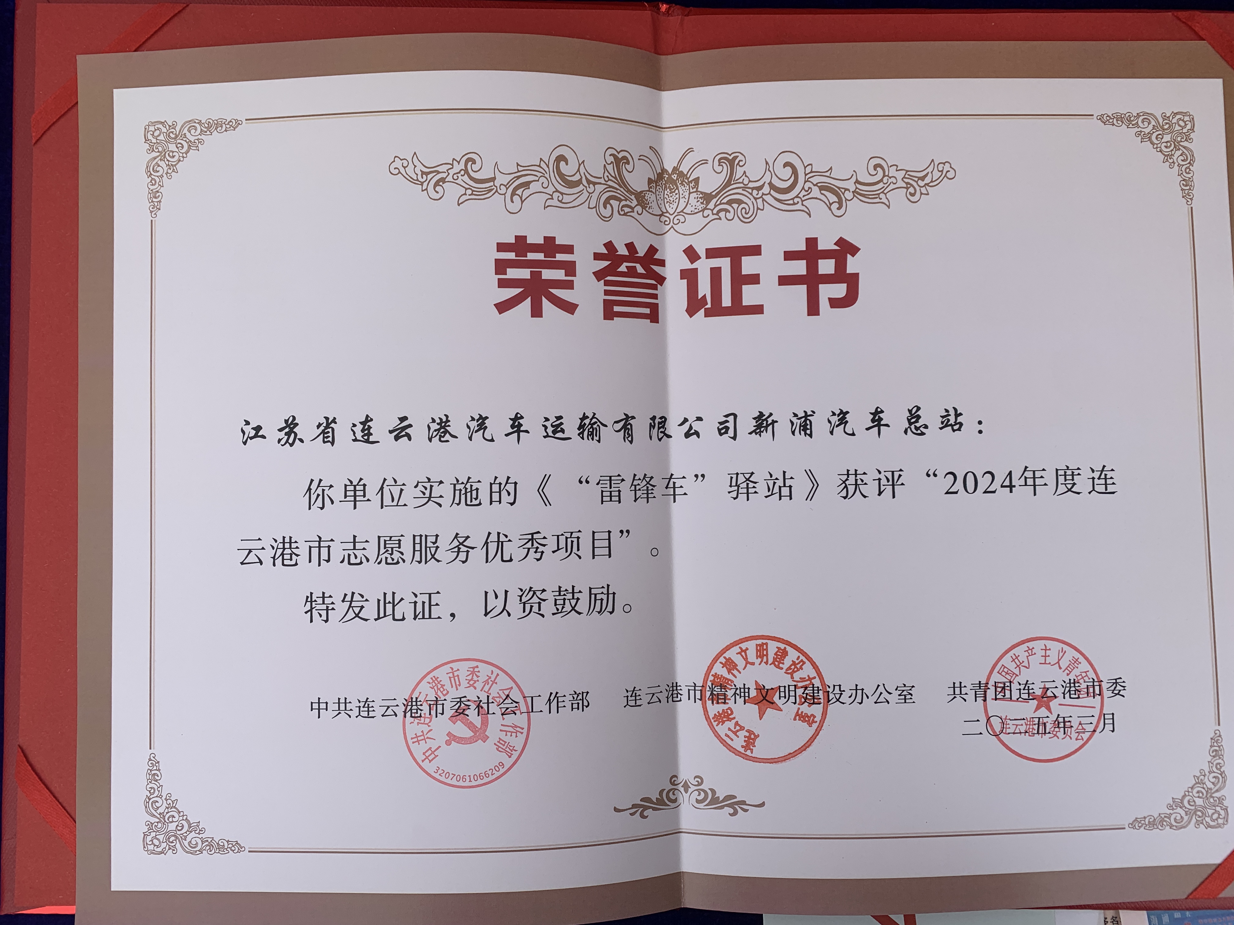 活動(dòng)現場(chǎng),新浦汽車(chē)總站“雷鋒車(chē)”驛站榮獲2024年度連云港市志愿服務(wù)優(yōu)秀項目稱(chēng)號,成為全場(chǎng)矚目的焦點(diǎn)。作為連云港市志愿服務(wù)的標桿項目,“雷鋒車(chē)”驛站多年來(lái)始終堅持“服務(wù)群眾、奉獻社會(huì )”的宗旨,以實(shí)際行動(dòng)踐行雷鋒精神,贏(yíng)得了社會(huì )各界的廣泛贊譽(yù)。