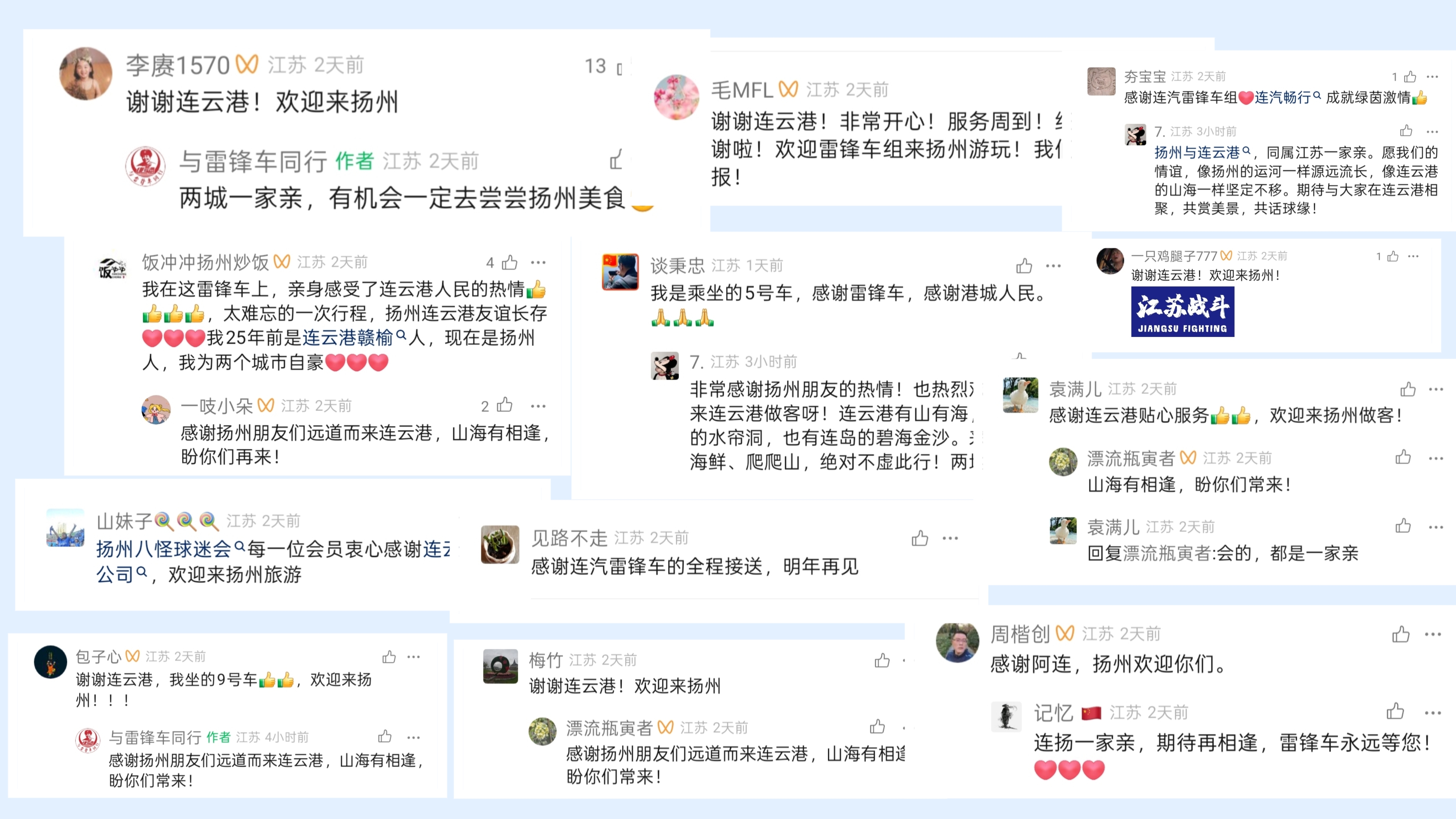 賽事落幕,溫暖卻在延續。賽后,揚州球迷紛紛在社交平臺留下真摯留言,字里行間滿(mǎn)是感動(dòng)與謝意:“謝謝連云港!歡迎來(lái)?yè)P州?!薄啊卒h車(chē)’讓我親身感受了連云港人民的熱情,太難忘的一次行程,揚州連云港友誼長(cháng)存!”“謝謝連云港!非常開(kāi)心!服務(wù)周到!細致用心!謝謝啦!歡迎‘雷鋒車(chē)’組來(lái)?yè)P州游玩!我們一定熱情回報!”“連汽的優(yōu)質(zhì)服務(wù)必須點(diǎn)贊!阿連‘雷鋒車(chē)’友誼地久天長(cháng)!”這些樸實(shí)的話(huà)語(yǔ),不僅是球迷對“雷鋒車(chē)”組服務(wù)的認可,更是對連云港城市文明形象的由衷褒獎。