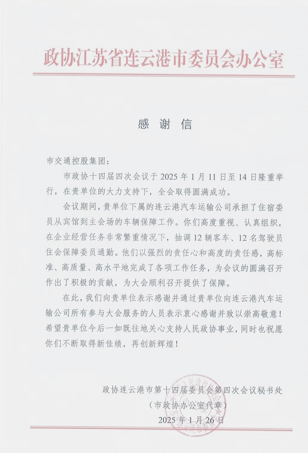 政協(xié)連云港市第十四屆委員會(huì )第四次會(huì )議秘書(shū)處在感謝信中,不僅向市交通控股集團所屬的連云港汽車(chē)運輸有限公司表達誠摯謝意,還向所有參與服務(wù)的人員致以崇高敬意。