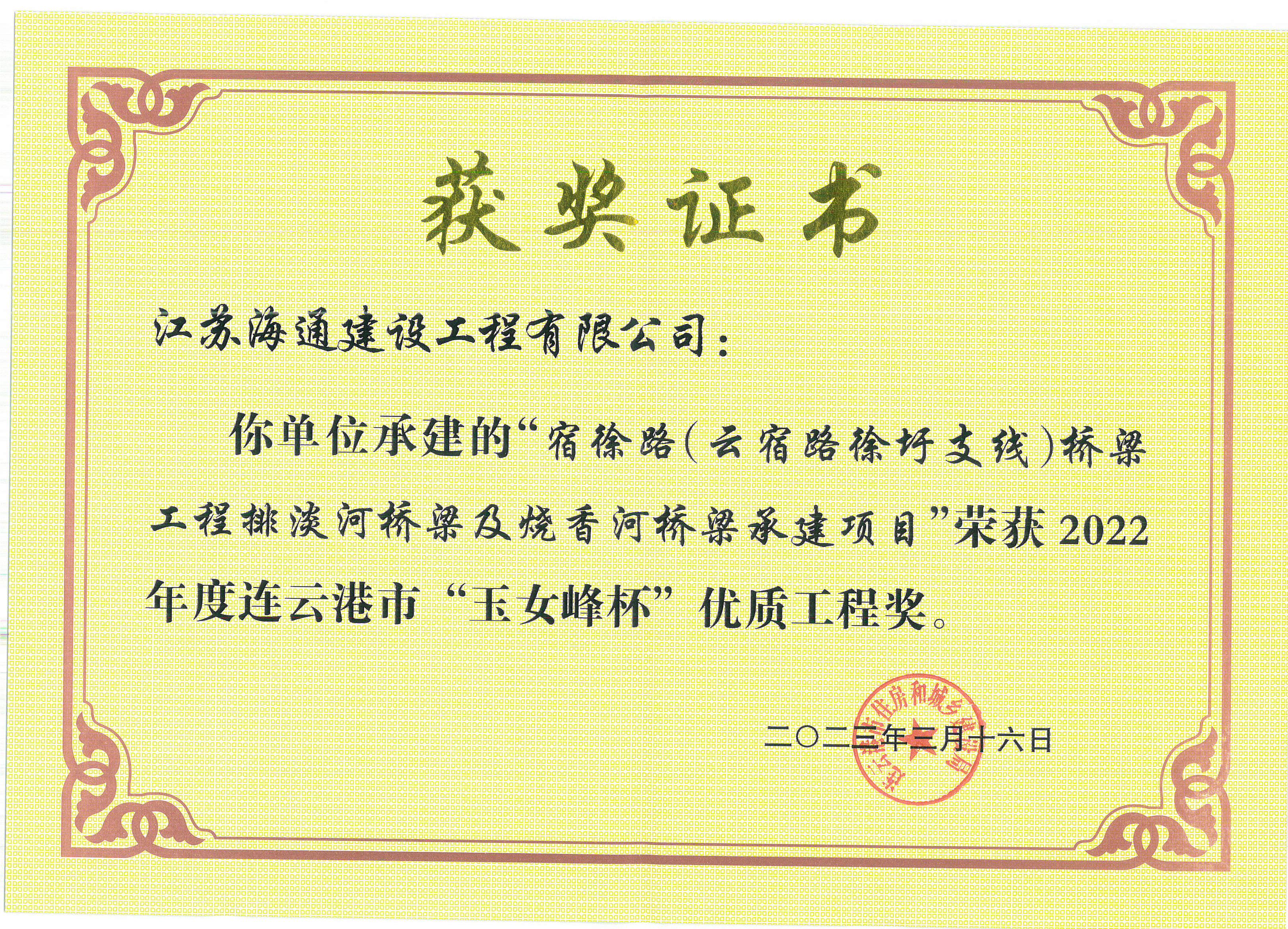 江蘇海建公司三項工程獲2022年度連云港市“玉女峰杯”優(yōu)質(zhì)工程獎