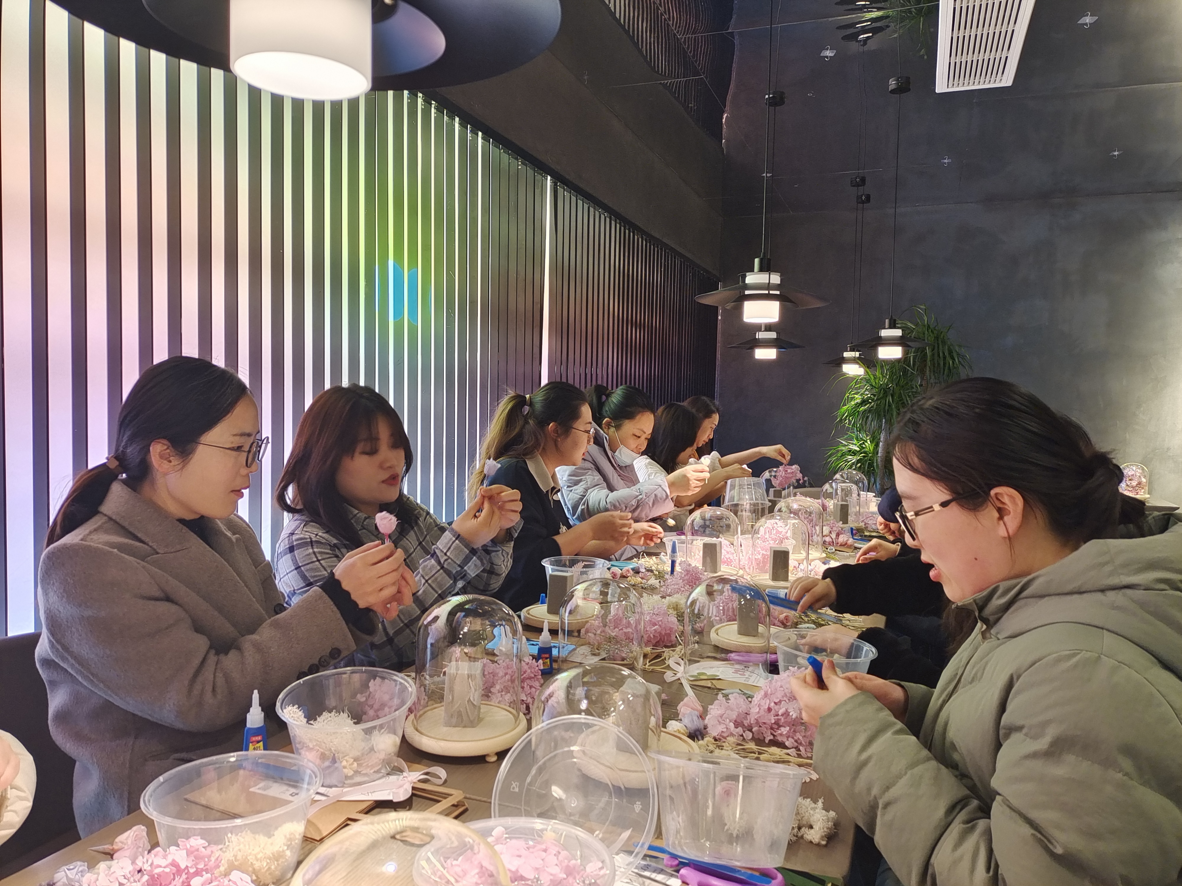 三月拂暖風(fēng),巾幗展笑顏。本次活動(dòng)以永生花藝學(xué)習的形式開(kāi)展,活動(dòng)伊始,老師講解了永生花插花的方法和技巧,為大家發(fā)放了永生花、剪刀、膠水及展示玻璃罩。隨后,女職工們便迫不及待地開(kāi)始了自己的創(chuàng )作之旅,各自小心翼翼地挑選著(zhù)心儀的花材,精心設計配色,時(shí)不時(shí)相互交流心得,分享彼此收獲,指導老師也加入其中,為他們答疑解惑?;顒?dòng)現場(chǎng)笑語(yǔ)盈盈,在輕松愉快的氛圍中,一個(gè)個(gè)清新雅致而又獨具風(fēng)格的永生花作品在一雙雙靈巧的手中誕生。