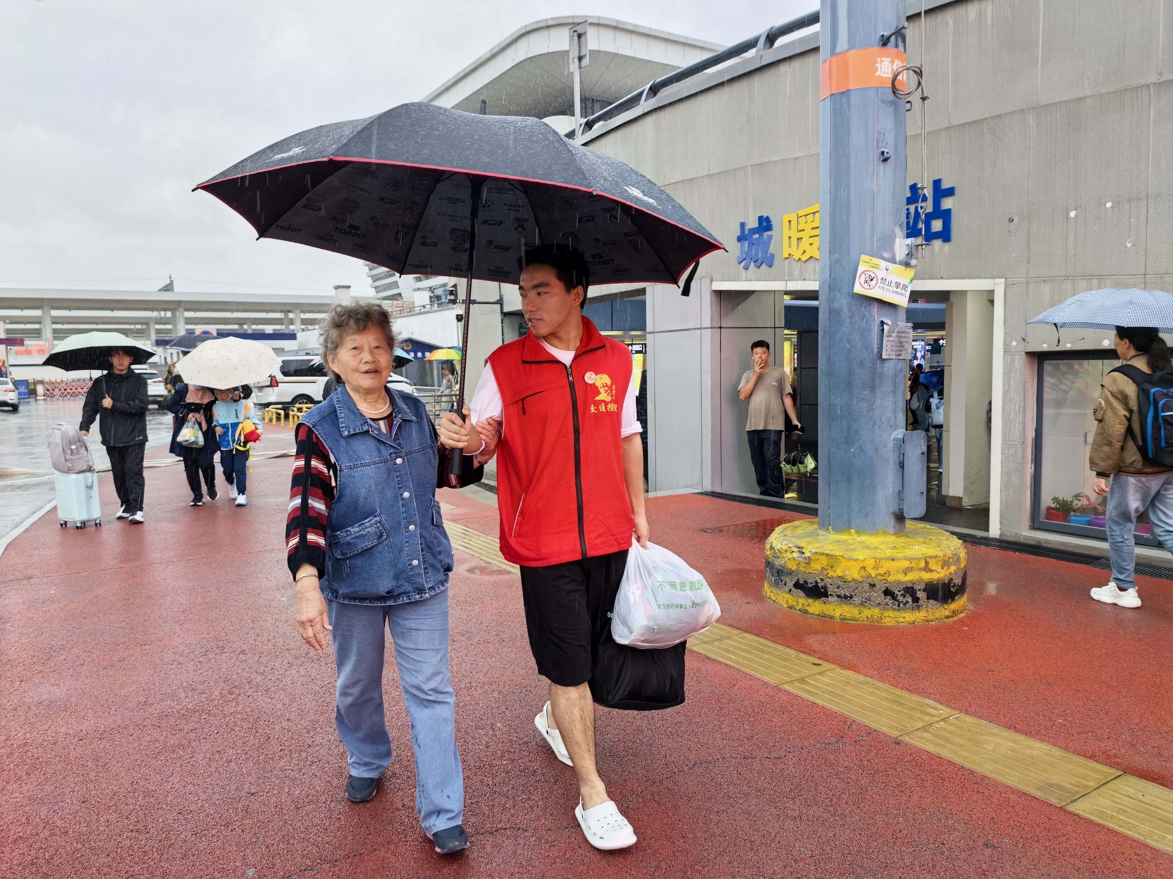 “小伙子,你鞋都濕透了,快歇歇吧!”一位提著(zhù)兩大袋行李的旅客看著(zhù)志愿者邵俊翔鞋子上的雨水,忍不住拉了拉他的胳膊。小邵卻笑著(zhù)把行李往自己肩上又挪了挪:“沒(méi)事阿姨,你要去的公交換乘點(diǎn)不遠,我送您過(guò)去?!闭f(shuō)著(zhù)就打起傘快步往換乘點(diǎn)走去,雨水順著(zhù)傘沿留下,打濕了他的衣褲,卻沒(méi)停下腳步。另一邊,志愿者們正幫助旅客搬運大件行李,用手推車(chē)將他們送到換乘點(diǎn)。