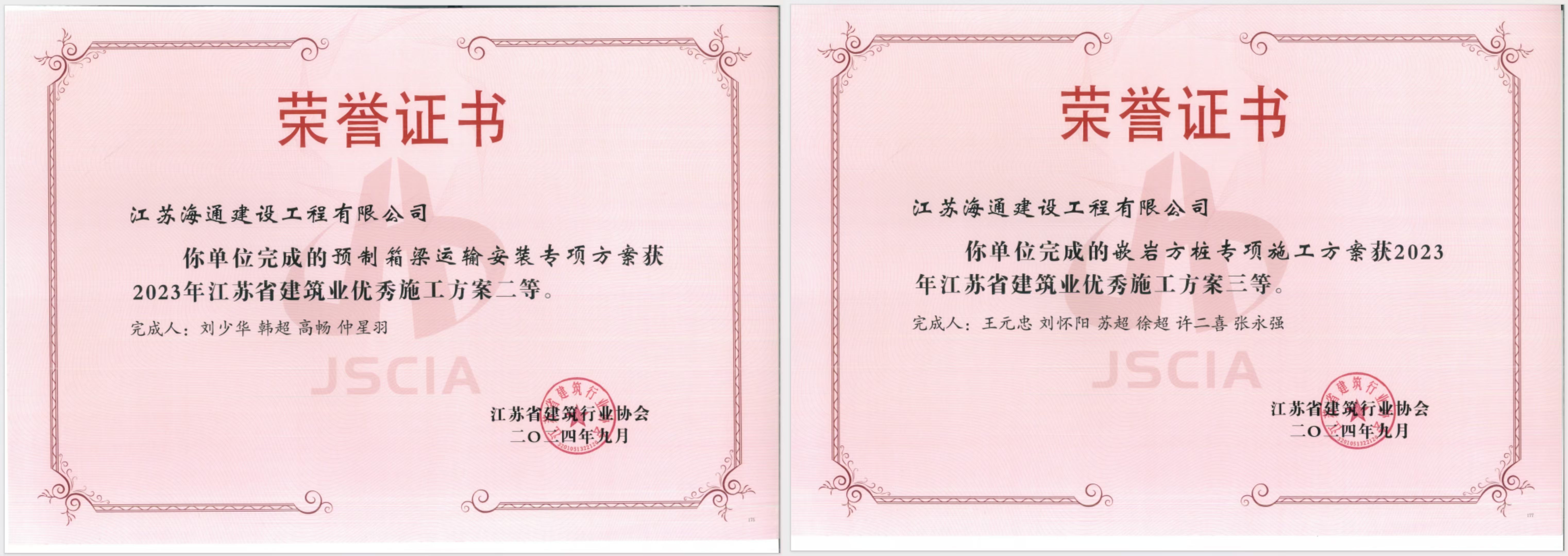 近日,江蘇省建筑行業(yè)協(xié)會(huì )公布了2023年度江蘇省建筑業(yè)優(yōu)秀施工方案評價(jià)結果,海建公司申報的三項施工方案獲得榮譽(yù),其中《預制箱梁運輸安裝專(zhuān)項方案》獲得江蘇省建筑業(yè)優(yōu)秀施工方案二等,《嵌巖方樁專(zhuān)項施工方案》、《二沉池、生物反應池滿(mǎn)水試驗專(zhuān)項方案》獲得江蘇省建筑業(yè)優(yōu)秀施工方案三等。