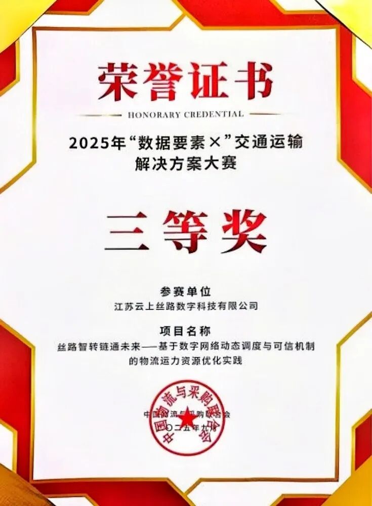 近日,2025中國物流與采購聯(lián)合會(huì )“數據要素×”交通運輸解決方案大賽全國總決賽在上海落幕,江蘇省物流產(chǎn)業(yè)促進(jìn)會(huì )副會(huì )長(cháng)單位——江蘇云上絲路數字科技有限公司憑借“絲路智轉鏈通未來(lái)——基于數字網(wǎng)絡(luò )動(dòng)態(tài)調度與可信機制的物流運力資源優(yōu)化實(shí)踐”項目,獲大賽三等獎。