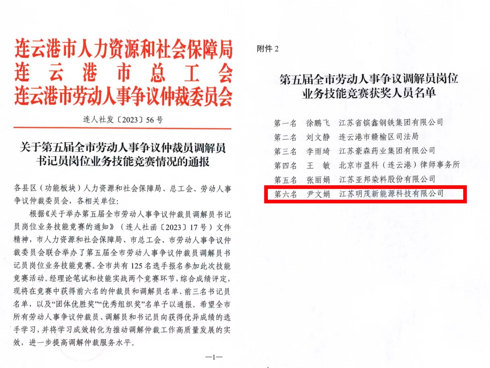 明茂公司尹文娟榮獲全市勞動(dòng)人事?tīng)幾h調解員崗位技能競賽三等獎